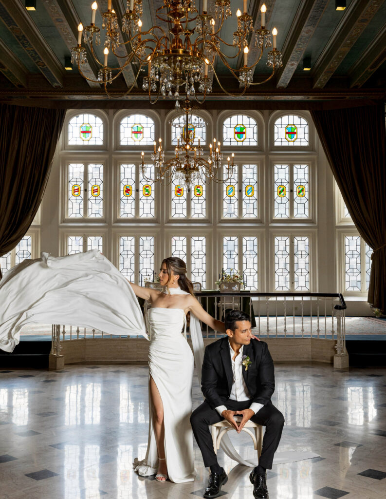Historic interiors with vintage charm. Timeless and elegant, this venue allows for both formal portraits and playful reception moments.