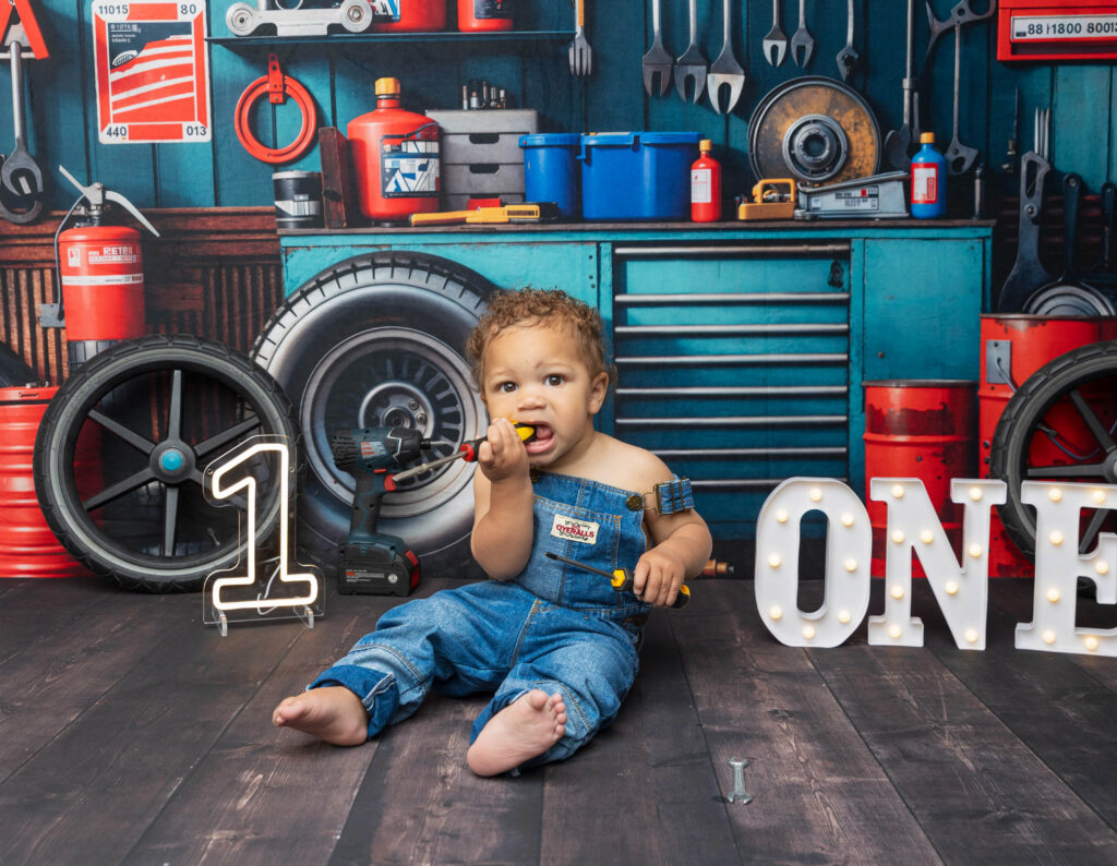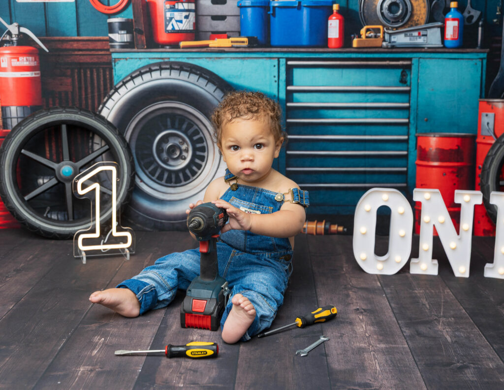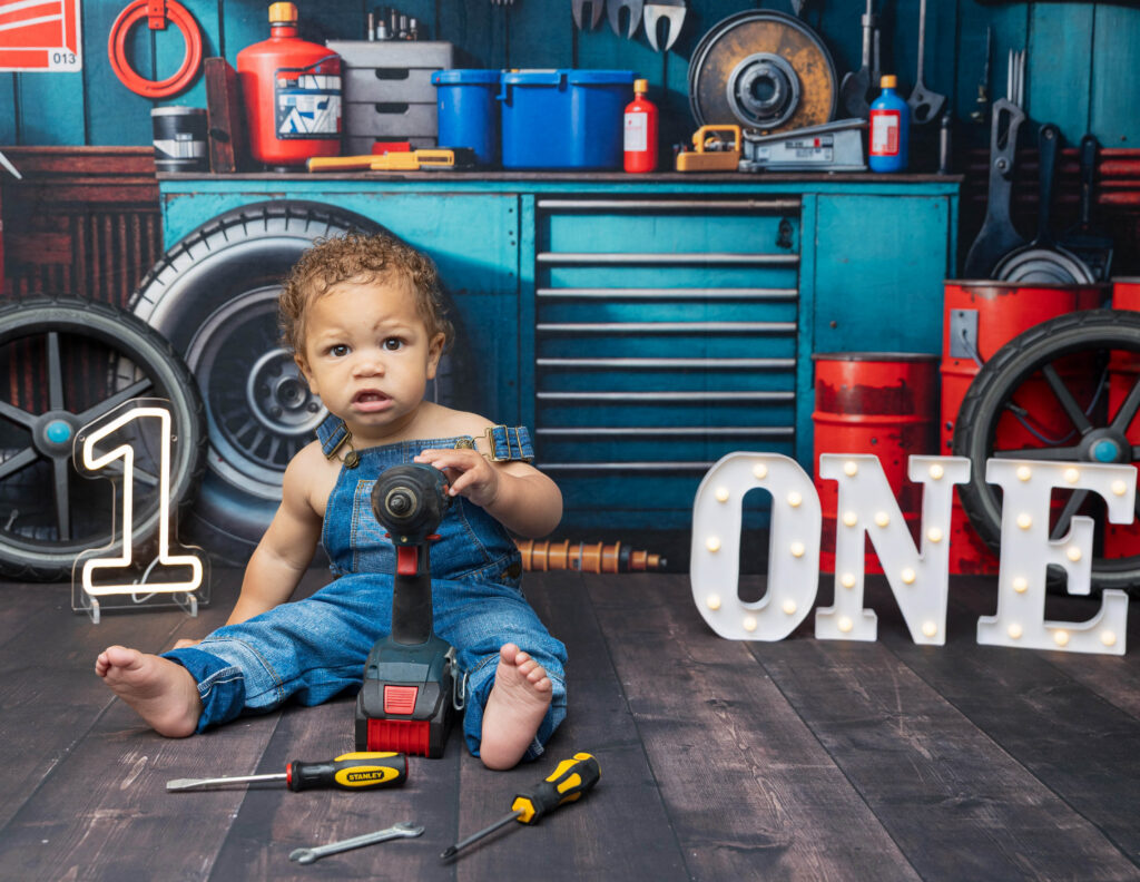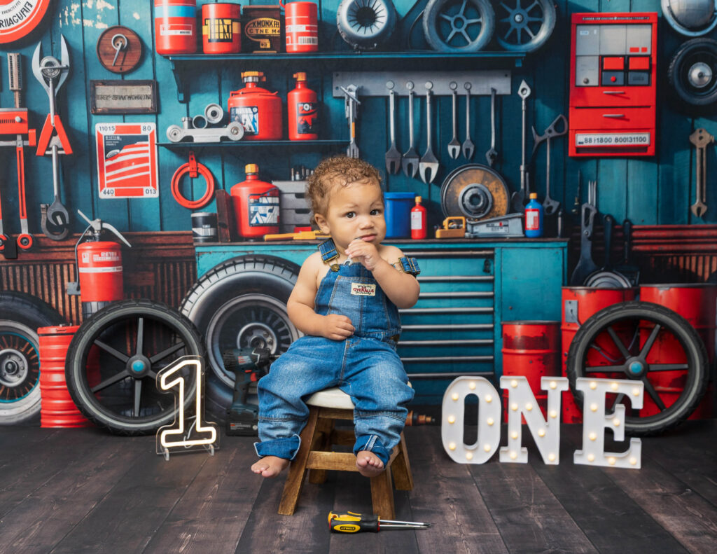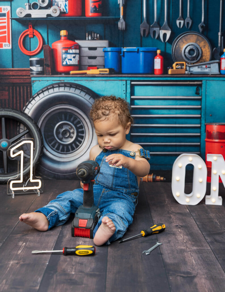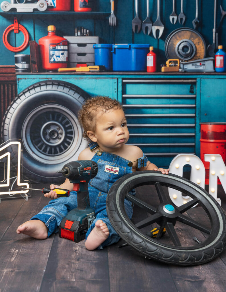 Zion’s dad is a mechanic, so we knew we had to make this session extra fun with a mechanic-inspired setup. From tools to garage-style details, this mechanic 1st birthday photoshoot was the perfect way to honor dad while celebrating Zion turning ONE.