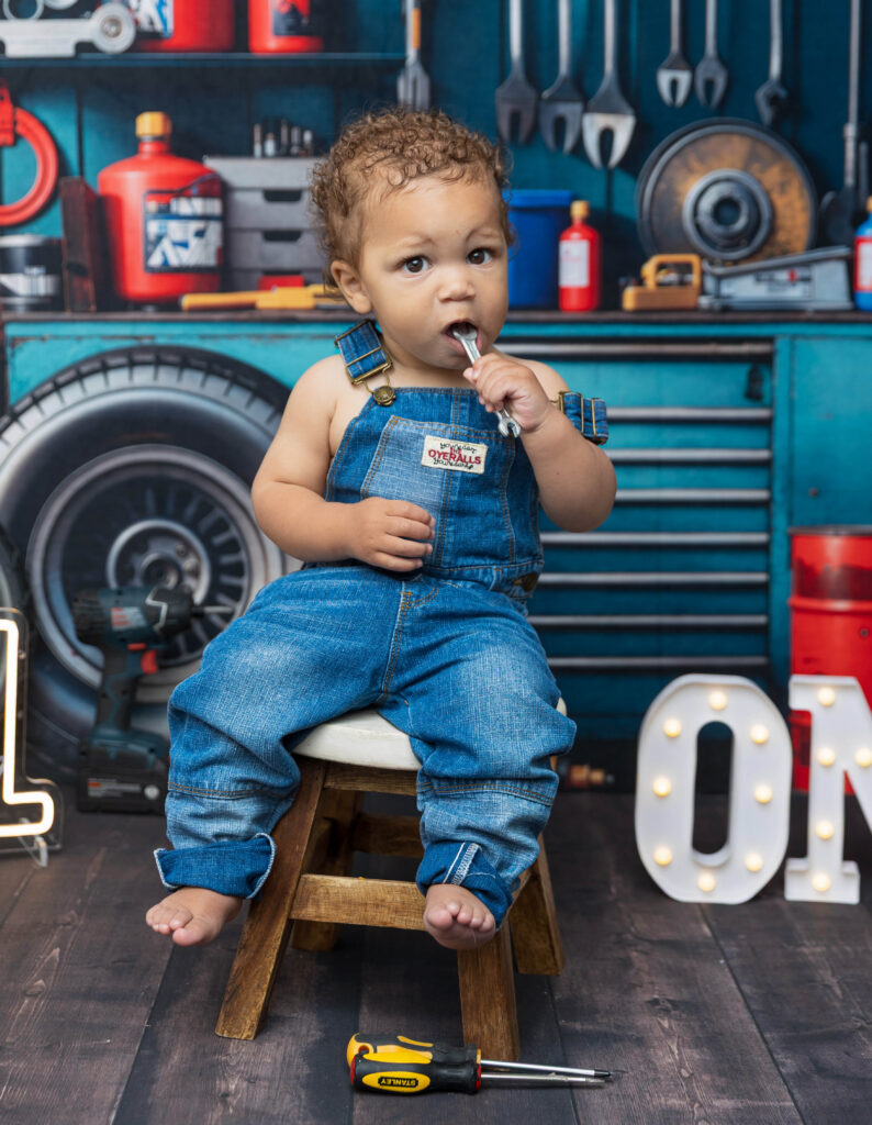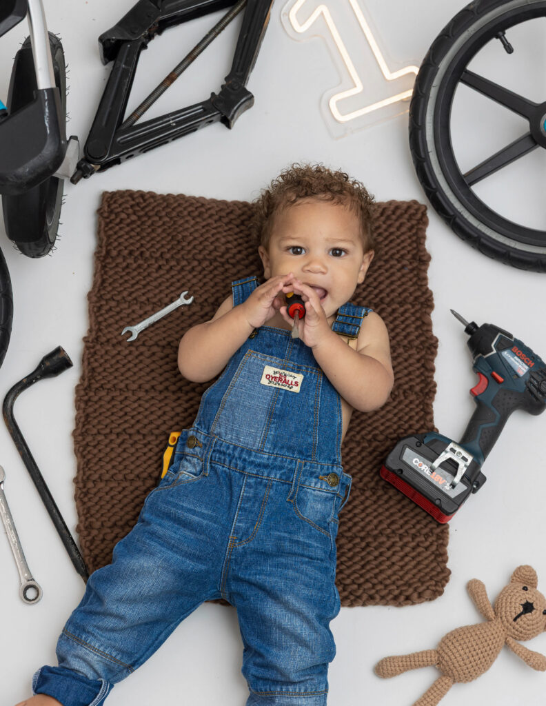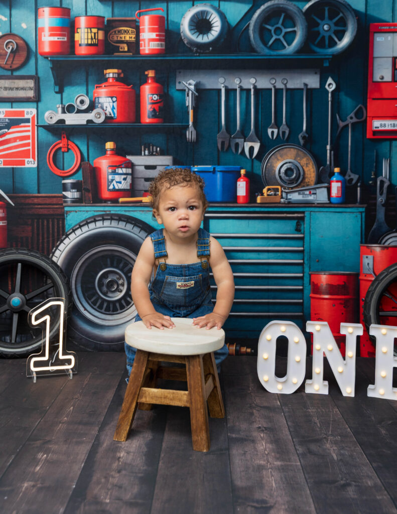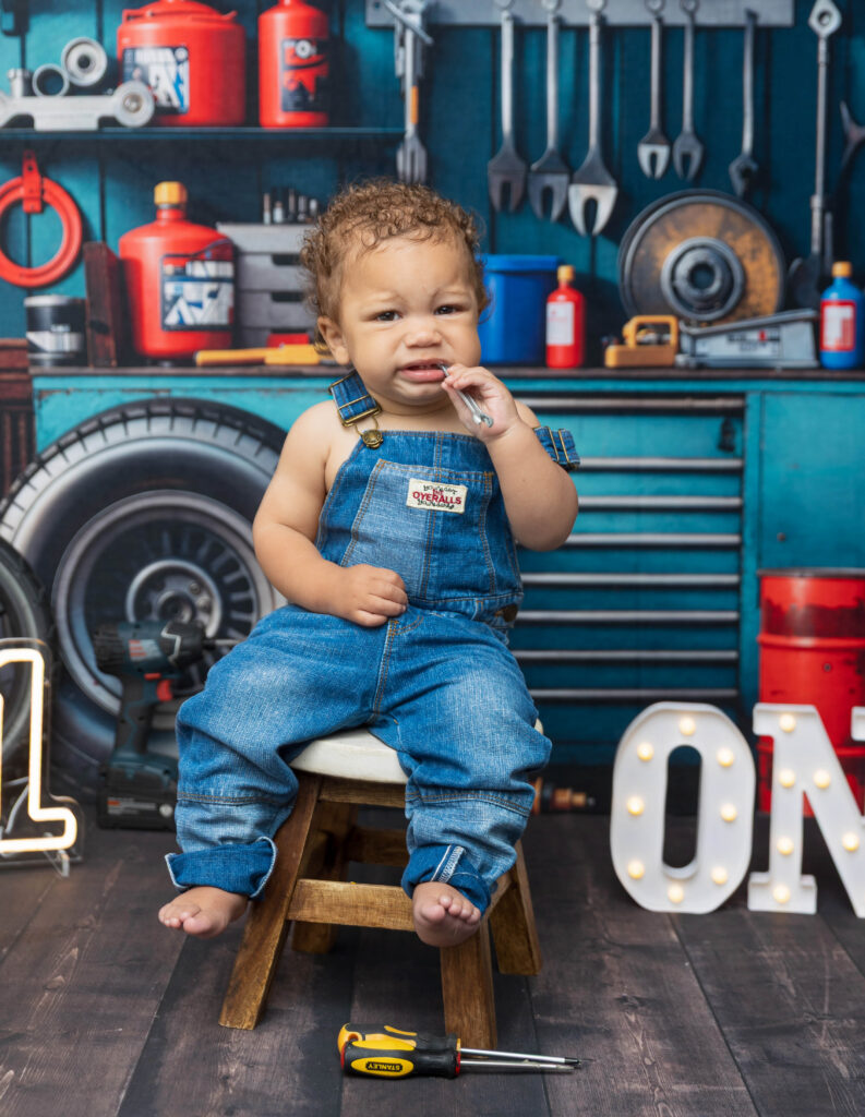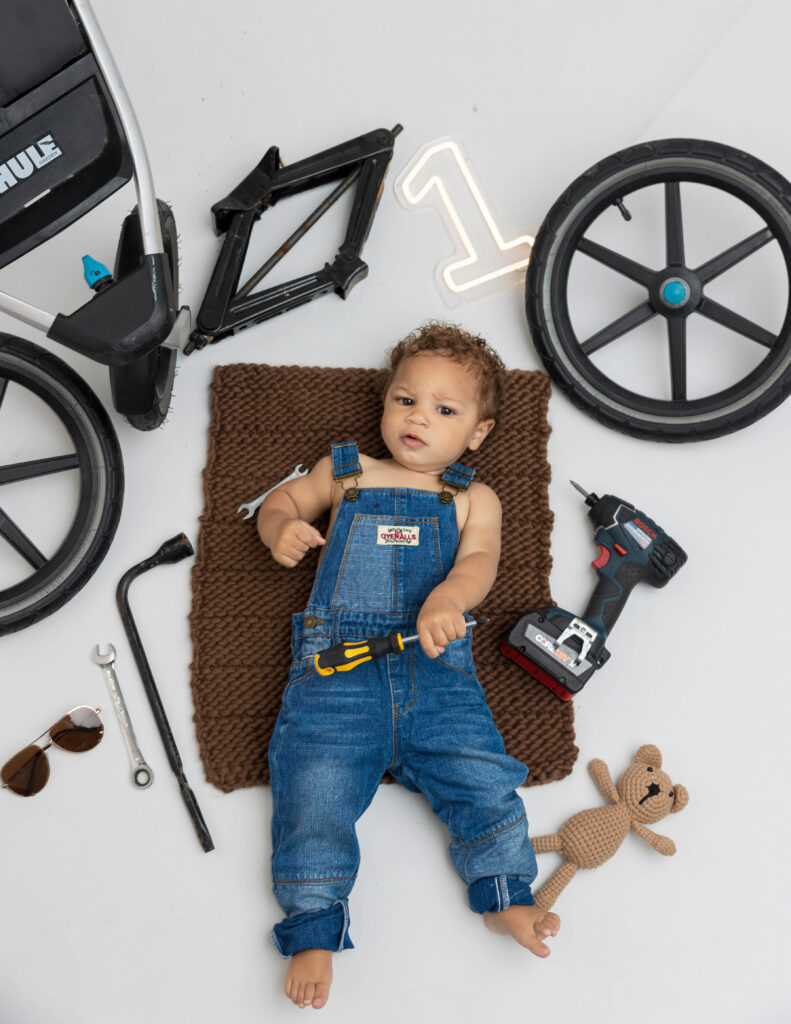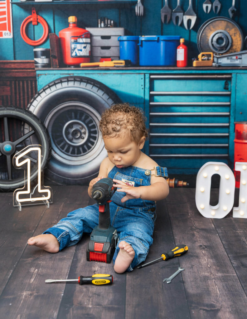Zion’s dad is a mechanic, so we knew we had to make this session extra fun with a mechanic-inspired setup. From tools to garage-style details, this mechanic 1st birthday photoshoot was the perfect way to honor dad while celebrating Zion turning ONE.