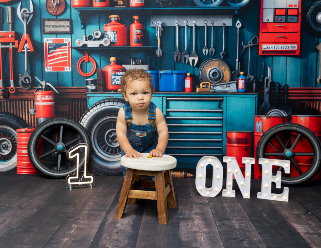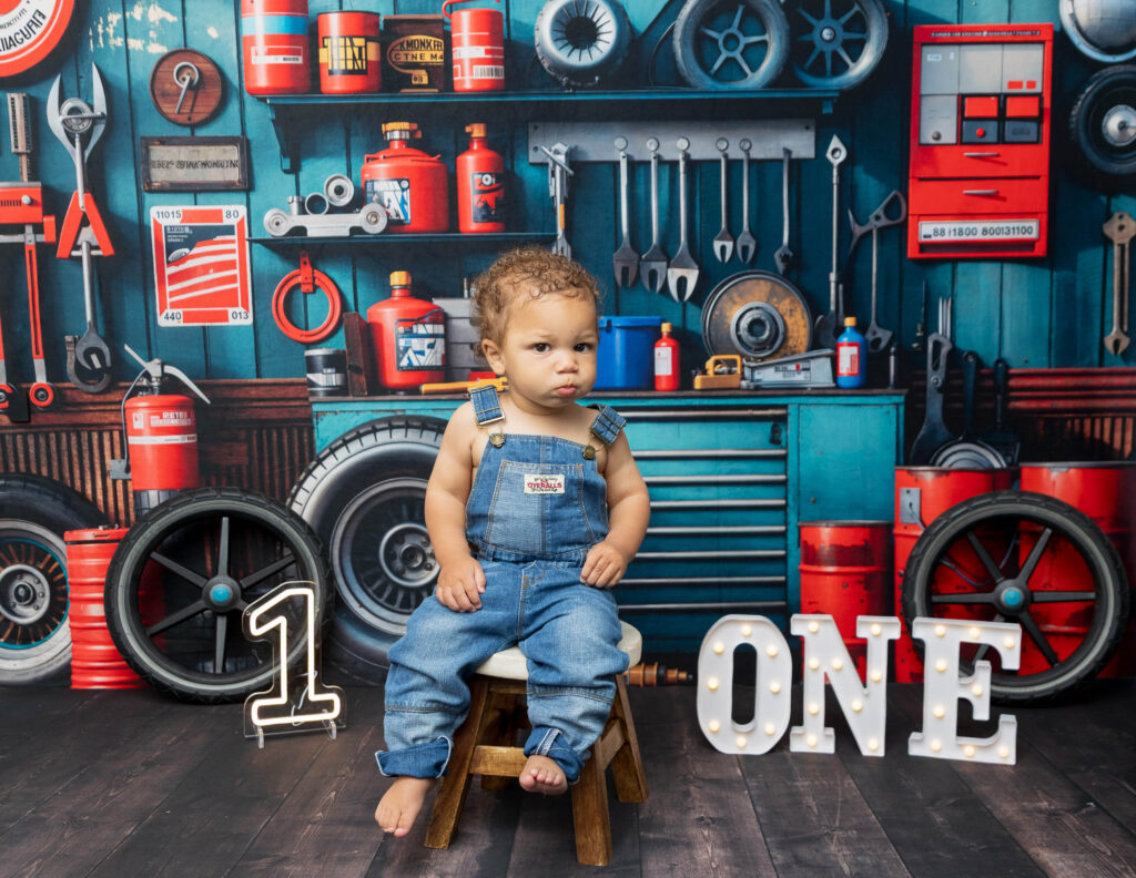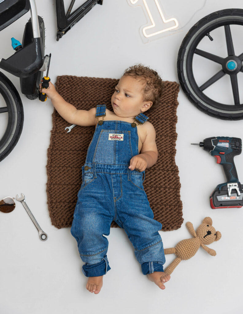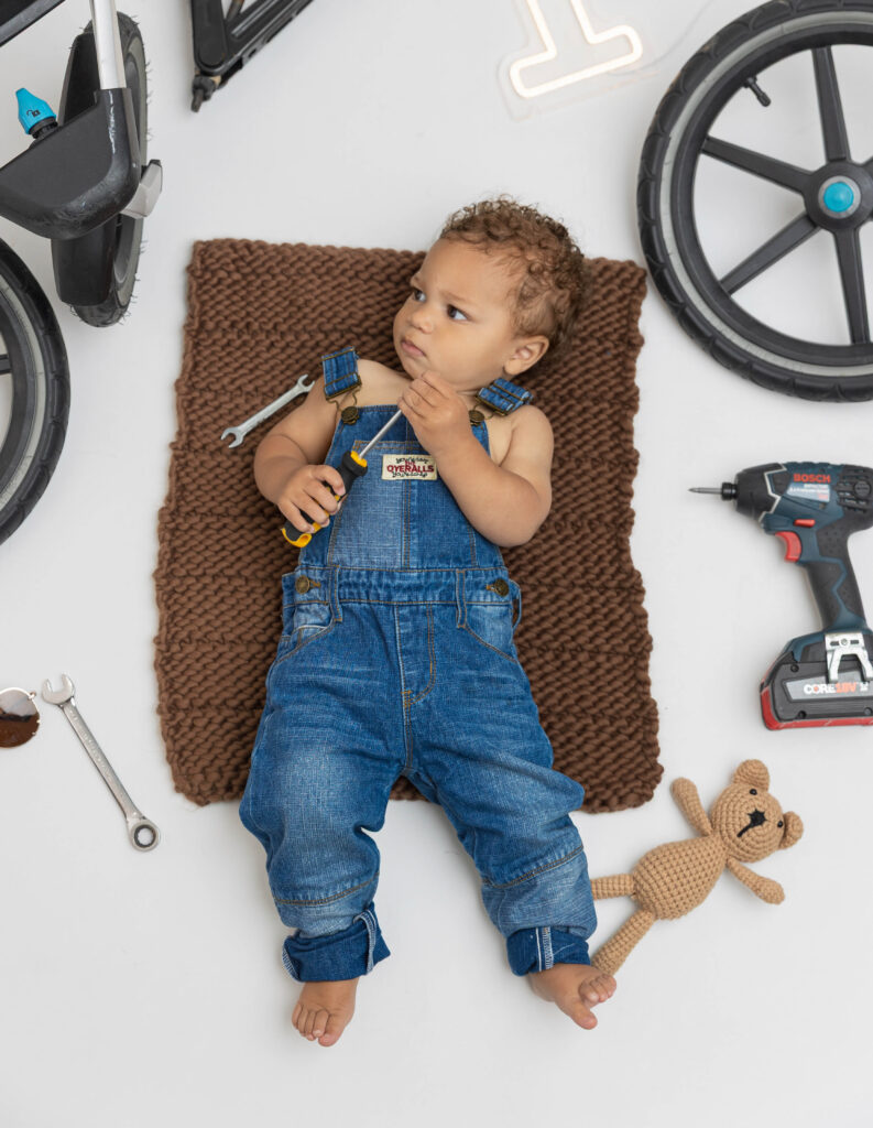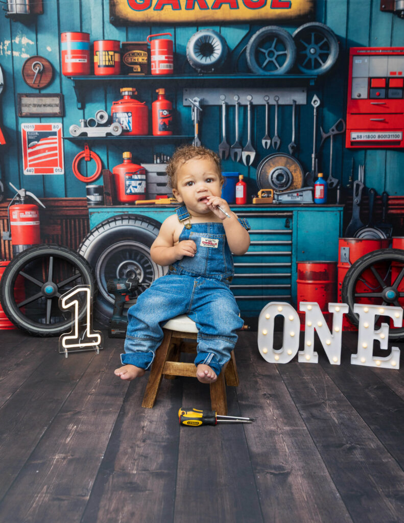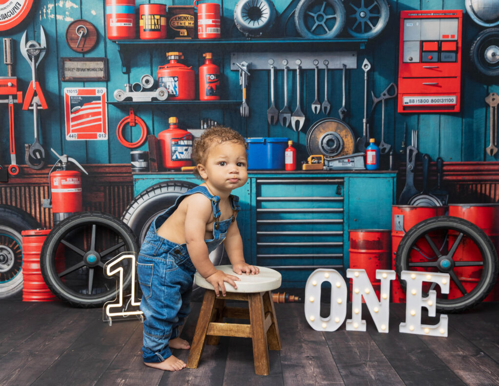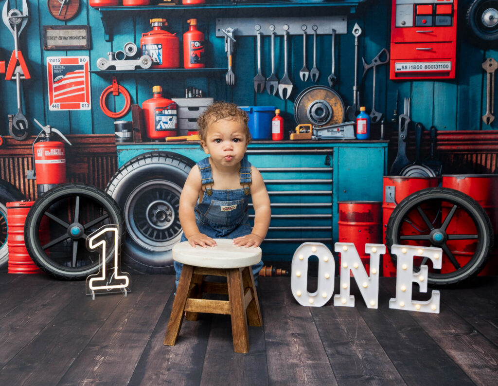 Zion’s dad is a mechanic, so we knew we had to make this session extra fun with a mechanic-inspired setup. From tools to garage-style details, this mechanic 1st birthday photoshoot was the perfect way to honor dad while celebrating Zion turning ONE.