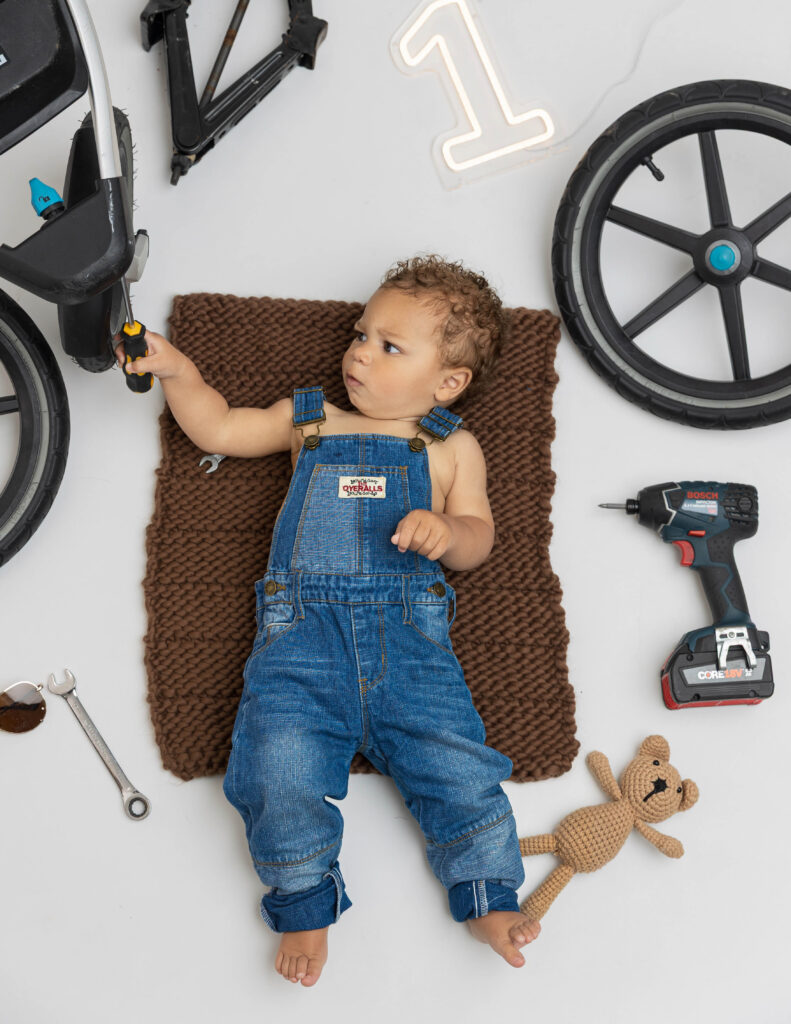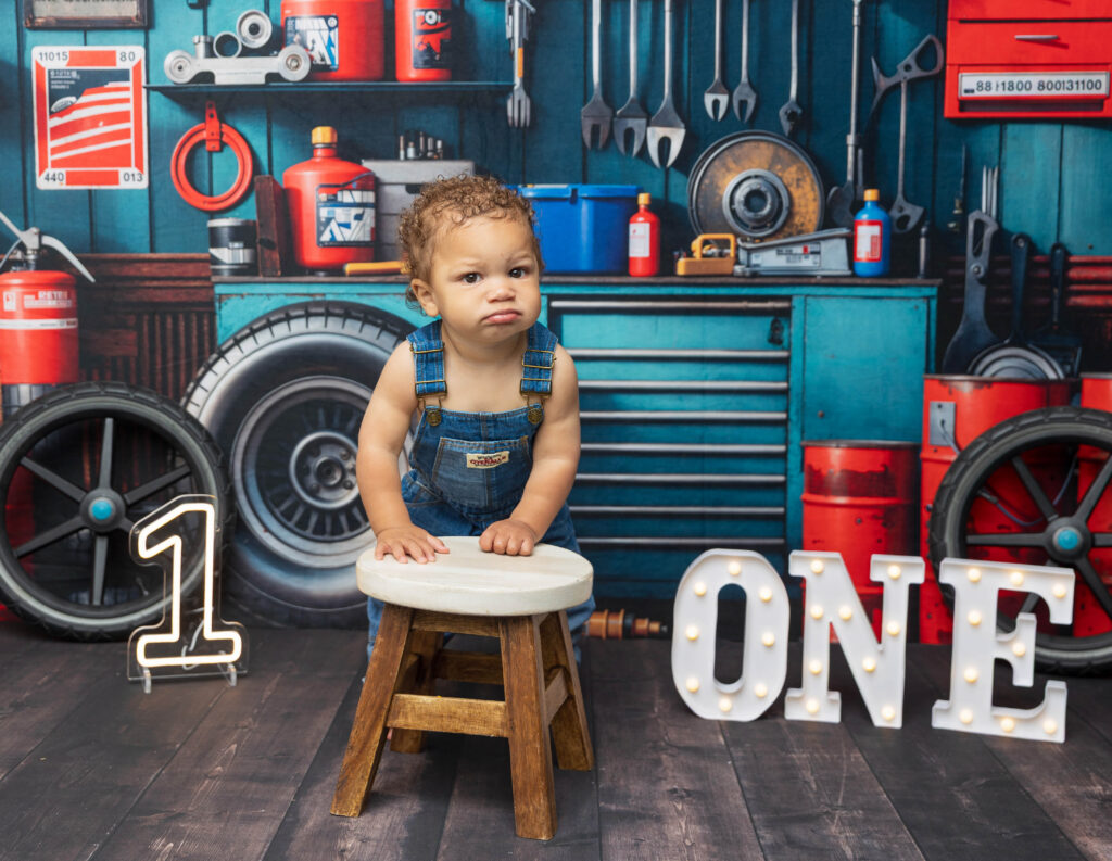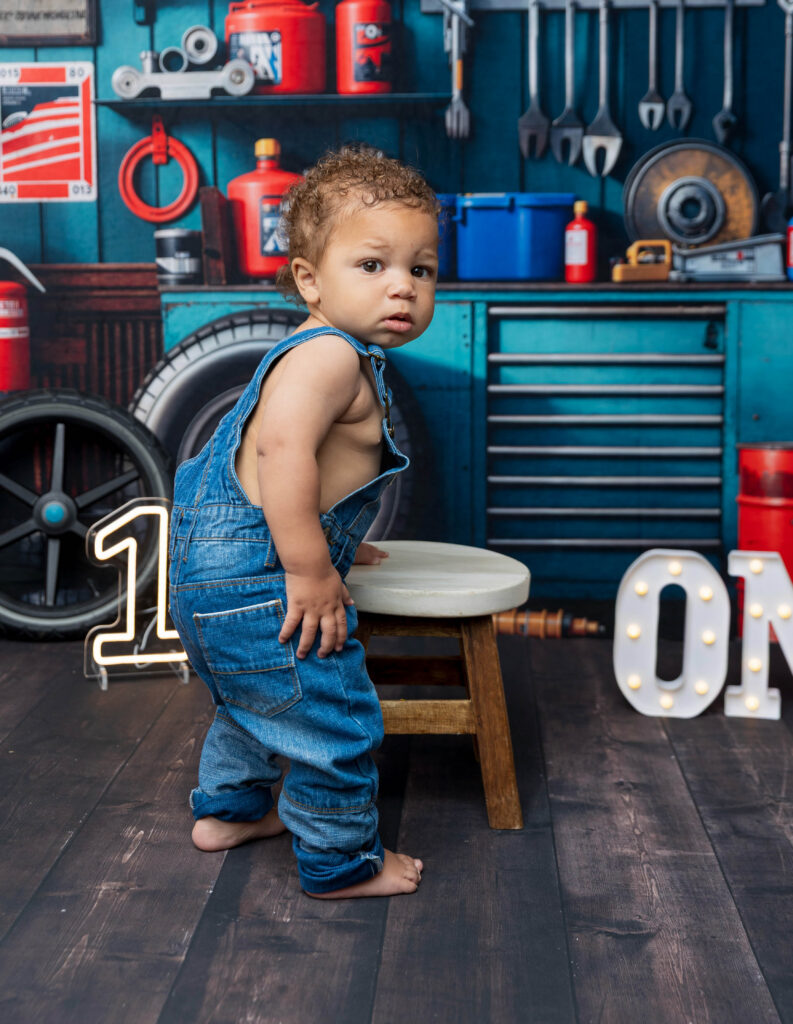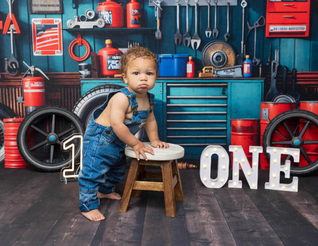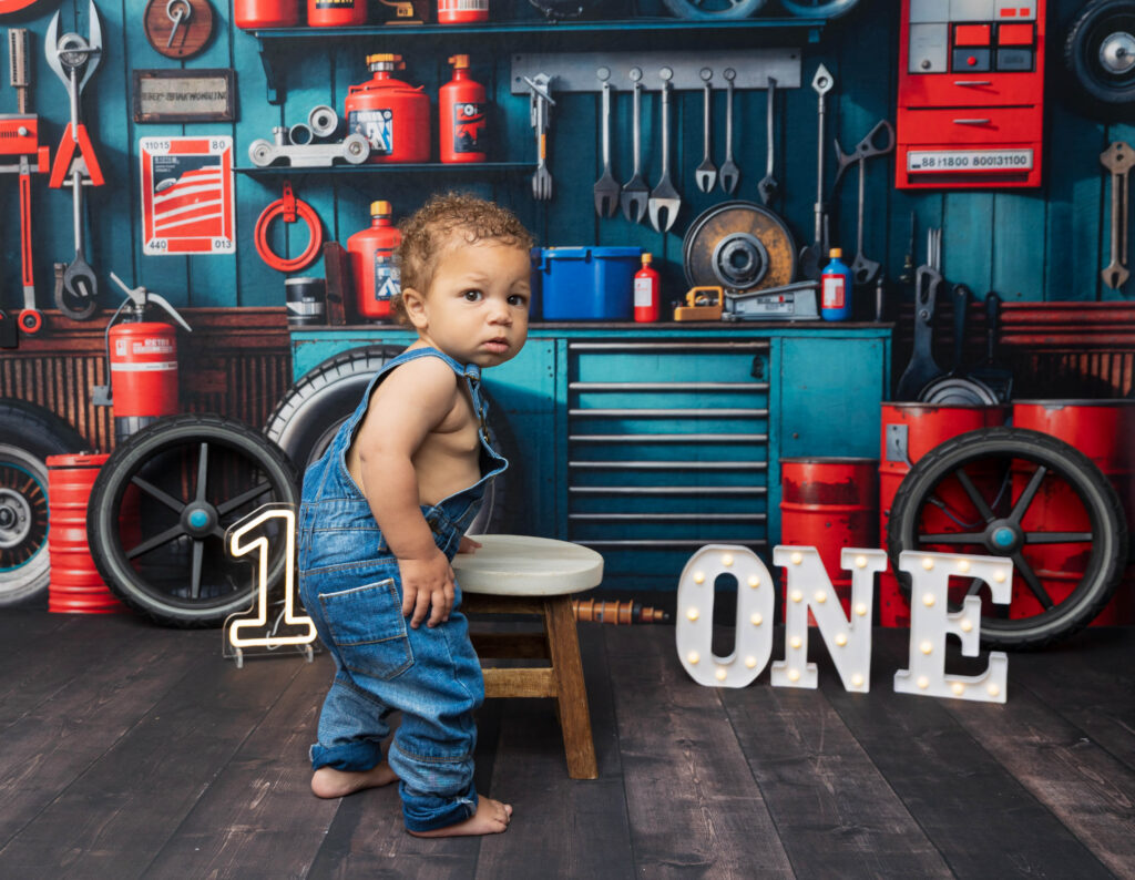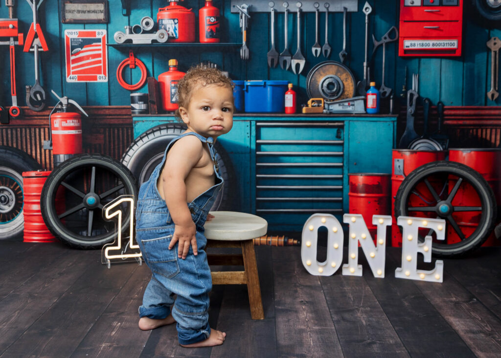 Zion’s dad is a mechanic, so we knew we had to make this session extra fun with a mechanic-inspired setup. From tools to garage-style details, this mechanic 1st birthday photoshoot was the perfect way to honor dad while celebrating Zion turning ONE.
