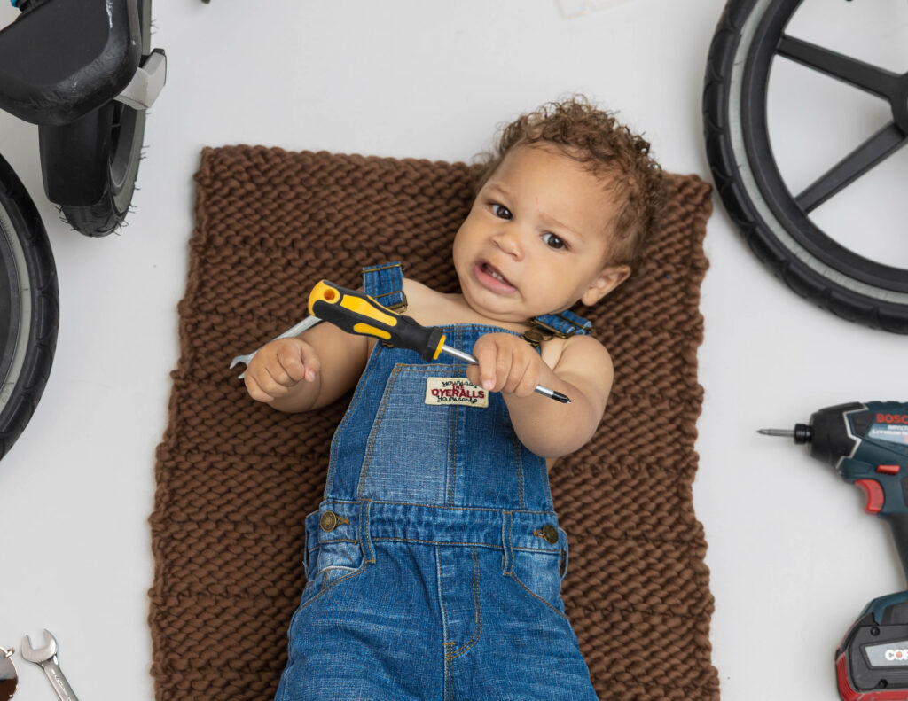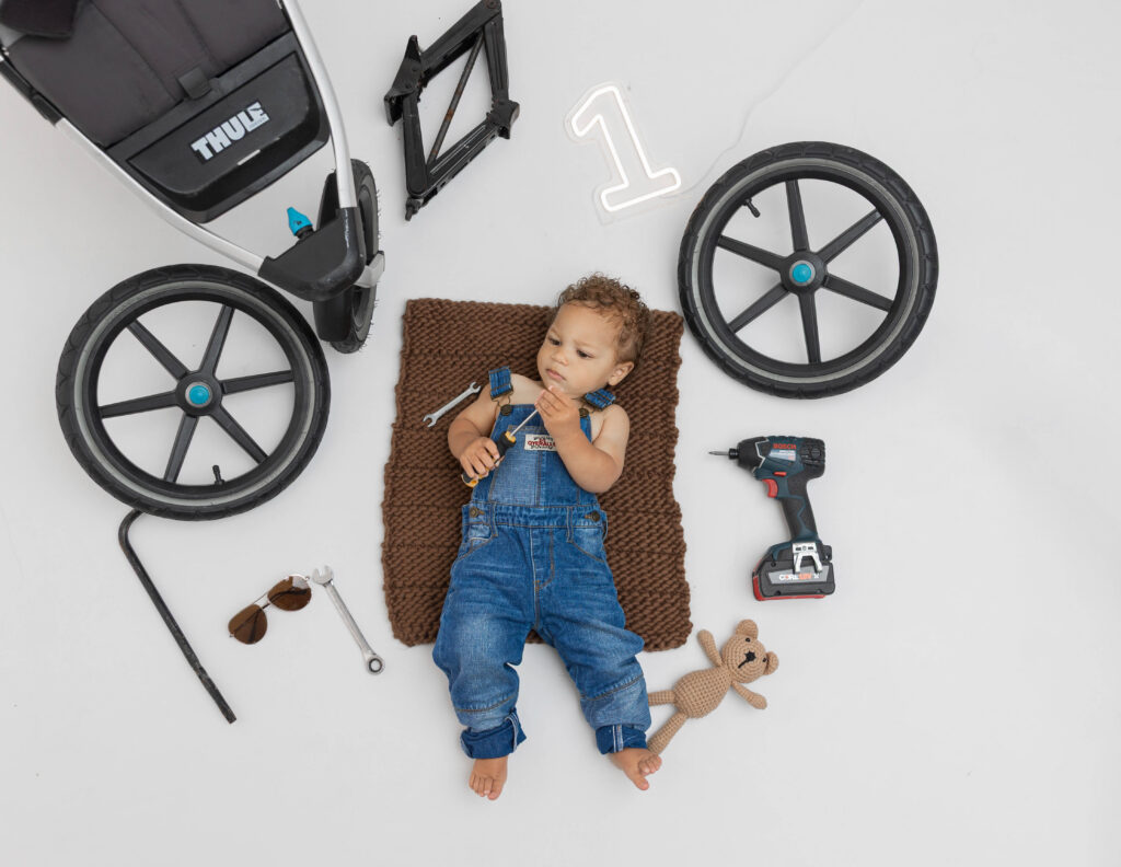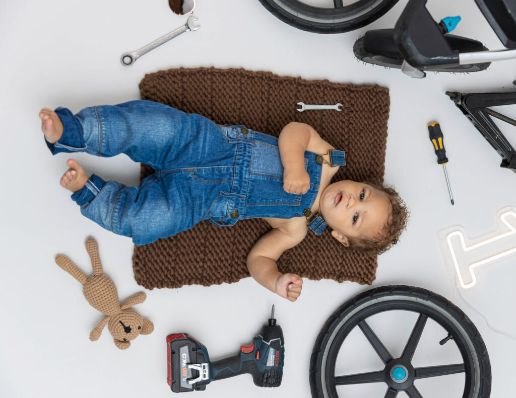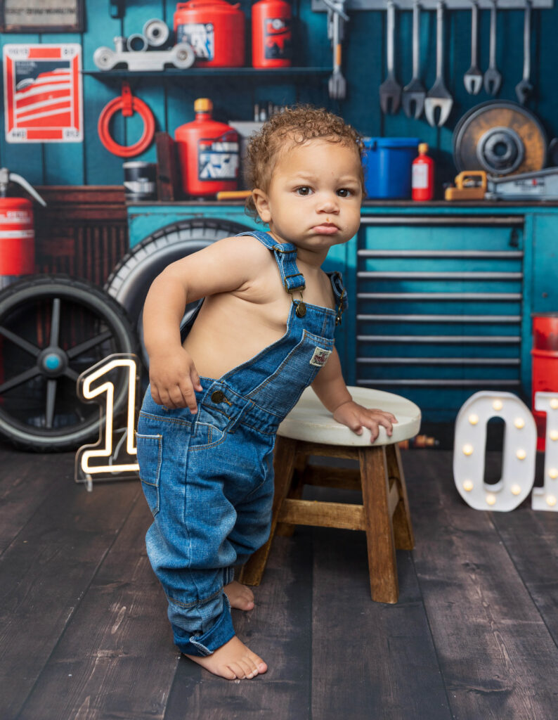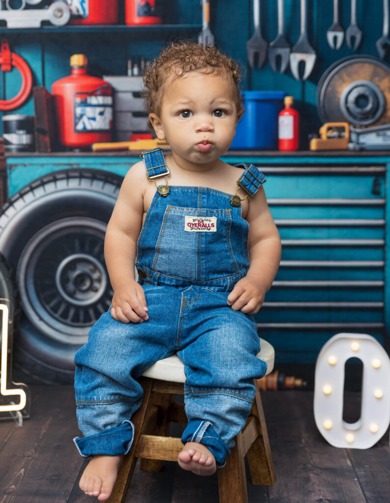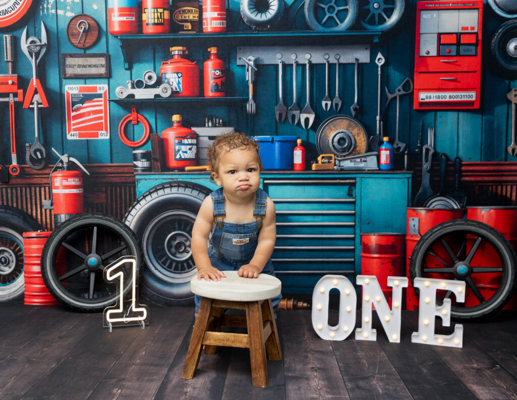 Zion’s dad is a mechanic, so we knew we had to make this session extra fun with a mechanic-inspired setup. From tools to garage-style details, this mechanic 1st birthday photoshoot was the perfect way to honor dad while celebrating Zion turning ONE.